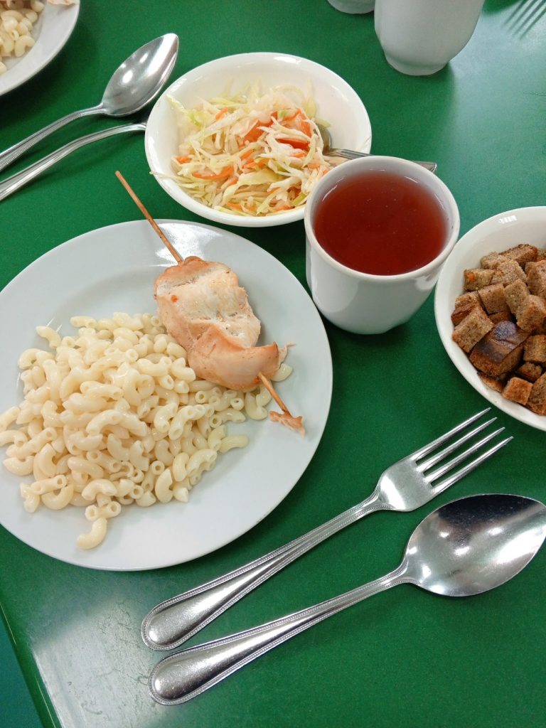 Сегодня у ребят на обед был салат витаминный, бульон мясной с гренками,куриный шашлычок с макаронными изделиями, компот из брусники и изюма!
